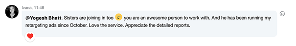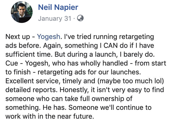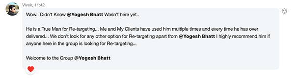 "Well Done Yogesh Bhatt, Not Only You had run my retargeting campaigns profitable but also provided service in such a smooth manner. If anyone want to get exponential results, Look No Where. This is the Best man who knows battle tested Skills of Retargeting."